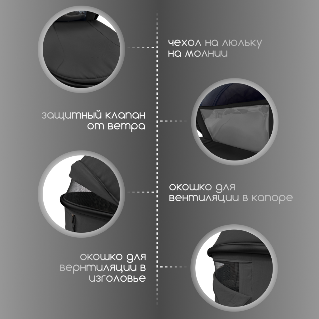 - Москитная секция в капоре и силиконовое смотровое окошко на магните обеспечивают циркуляцию воздуха и удобный контроль за ребёнком.