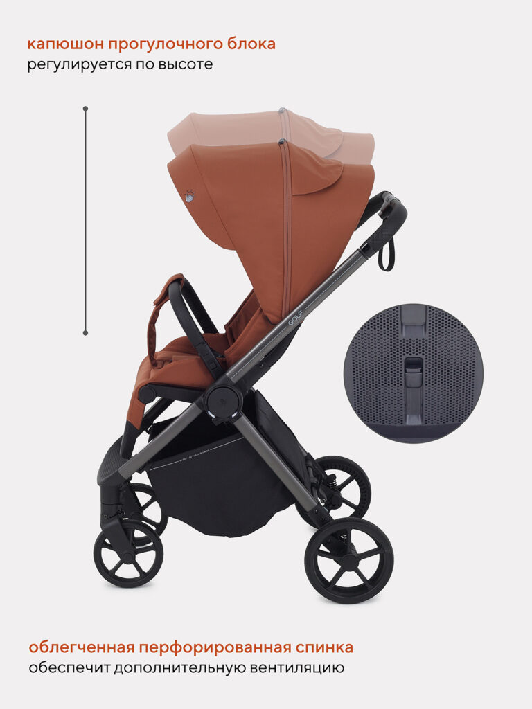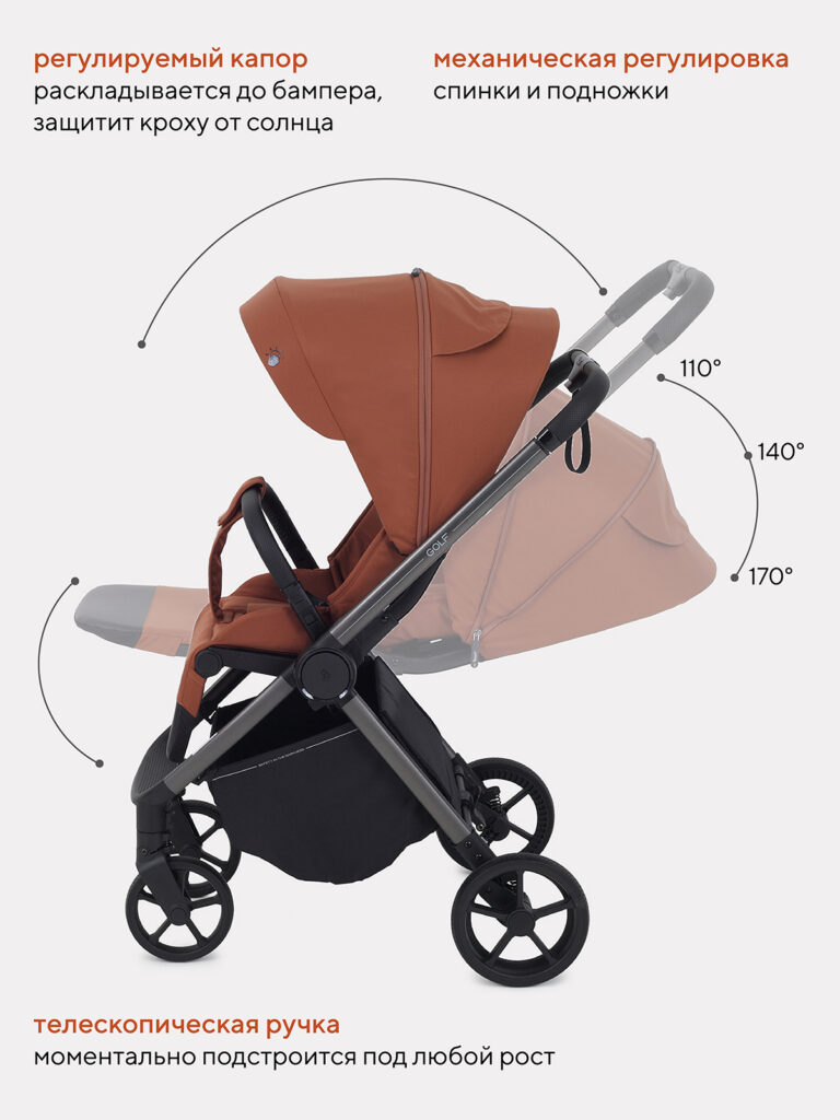 - Комфорт для ребёнка: Многопозиционная спинка, включая горизонтальное положение для сна, регулируемый капюшон с дополнительной секцией на молнии, утеплённая накидка для ножек.