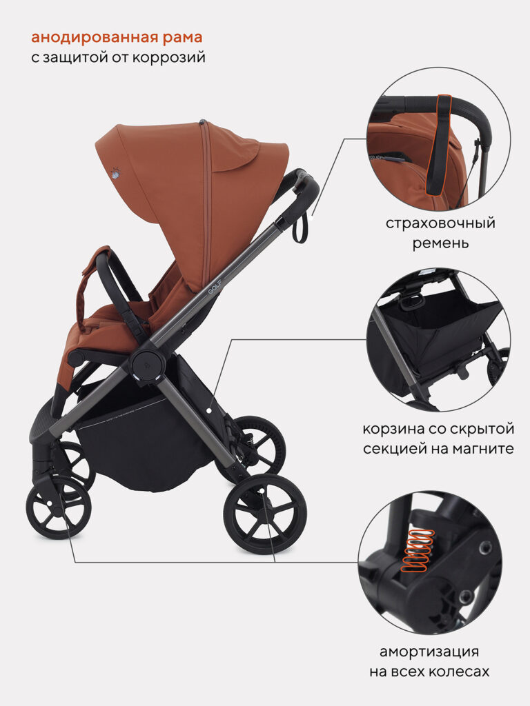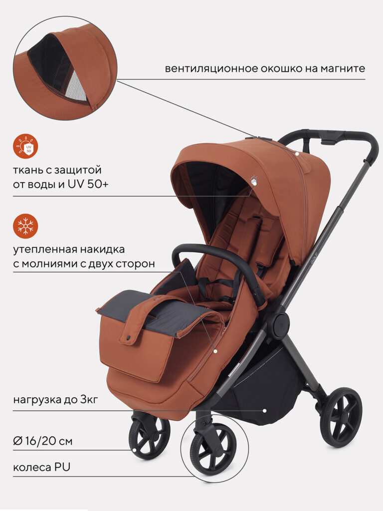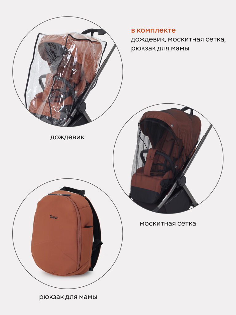 - Аксессуары: Москитная сетка, дождевик с вентиляционными отверстиями, сумка-рюкзак для мамы с несколькими отделениями и ортопедической спинкой.