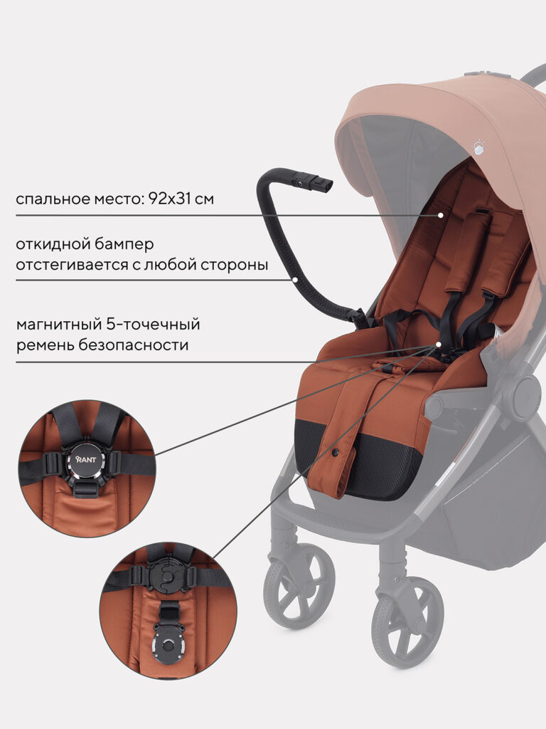 - Безопасность: 5-точечный ремень безопасности с магнитным замком, который легко открывается взрослым, но недоступен для ребёнка.